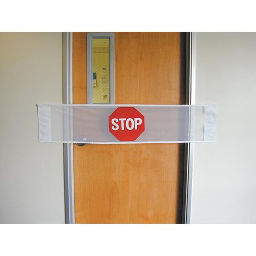 The posey stop sign door banner is a mesh banner with bright red octagonal stop sign that easily attaches to a door frame up to 53 inches wide the included hook and loop velcro strips.